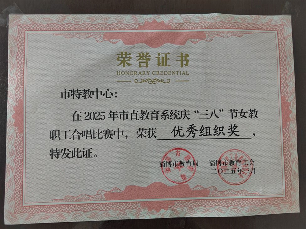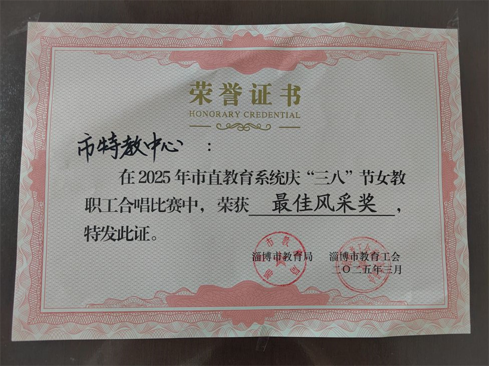 ??3月7日,淄博市教育工會(huì)舉辦的市直教育系統(tǒng)慶“三八”節(jié)女教職工合唱比賽在淄博齊盛高級(jí)中學(xué)隆重舉行。淄博市特教中心代表隊(duì)在比賽中表現(xiàn)出色、脫穎而出,以一首《星辰大?!穵Z得最佳風(fēng)采獎(jiǎng),并獲最佳組織獎(jiǎng)。