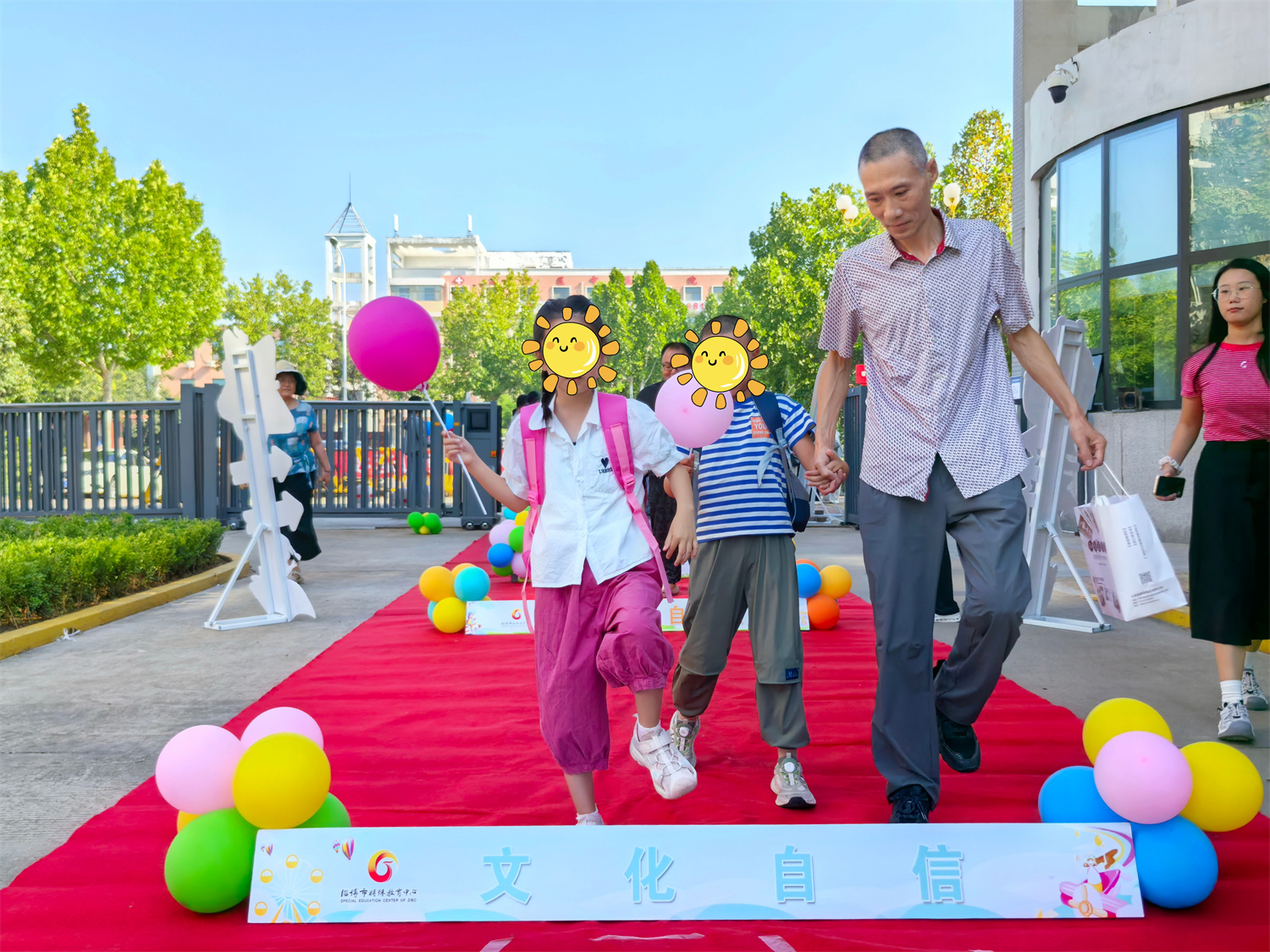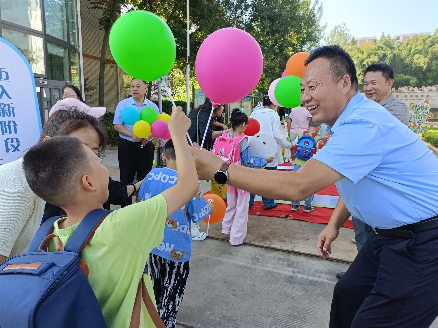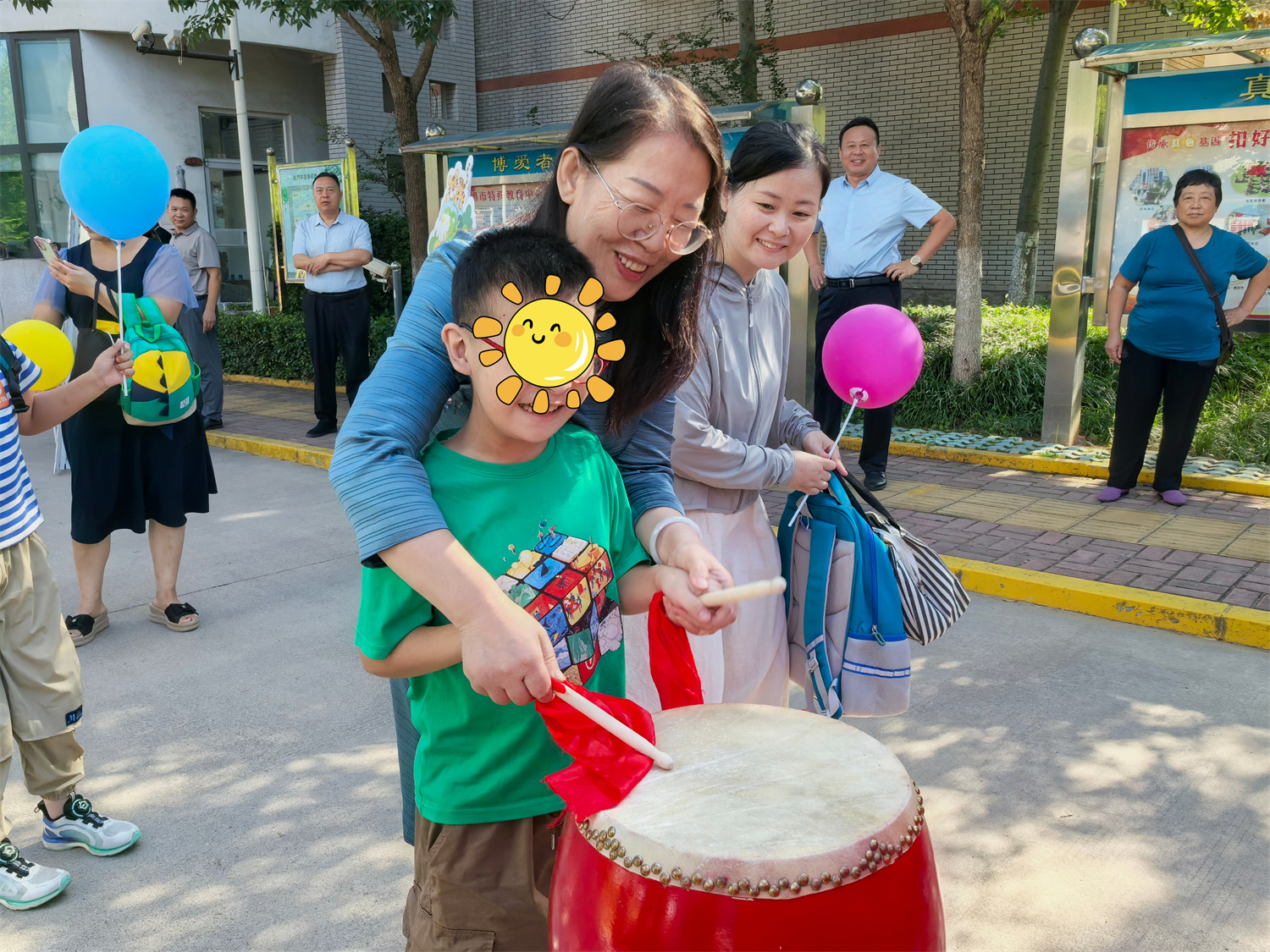 9月2日上午,學(xué)校以“禮潤童心 筑夢新程”為主題,為2025級新生舉辦了一場暖心開學(xué)禮。校領(lǐng)導(dǎo)在校門口親切迎接,老師們敲響大鼓迎接新生,在家長的陪伴下,孩子們輪流擊鼓并跨越寫滿禮儀規(guī)范的“明禮路”;進(jìn)入教室后,老師們用朱砂為孩子們點(diǎn)“智慧痣”開啟智慧之門,孩子們在彩紙上畫出對校園生活的憧憬并折成紙飛機(jī)共同放飛,還挑選“蘋果”“橙子”等寓意吉祥的卡通果蔬頭套拍照留影,最后通過繪制“笑臉彩板”互相打招呼互動,幫助孩子們更快融入集體。