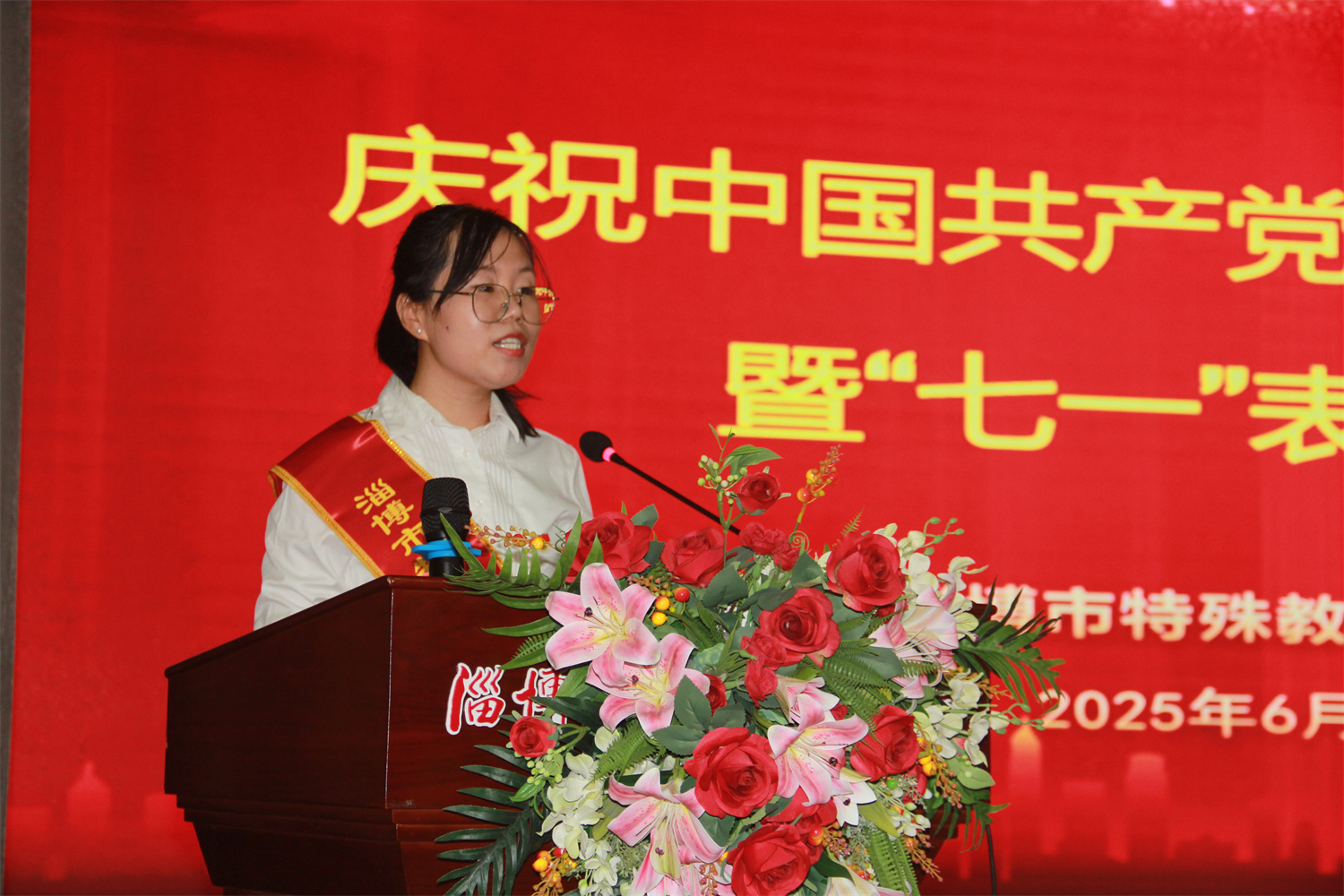 隨后,優(yōu)秀共產(chǎn)黨員代表鞏文文同志發(fā)言。她深情講述了自己在特教崗位上的堅守與付出。她表示將以此次表彰為契機(jī),繼續(xù)以專業(yè)和愛心守護(hù)特殊兒童成長,做他們“黑暗中的微光”。真摯的發(fā)言展現(xiàn)了特教黨員的責(zé)任擔(dān)當(dāng),贏得全場掌聲。