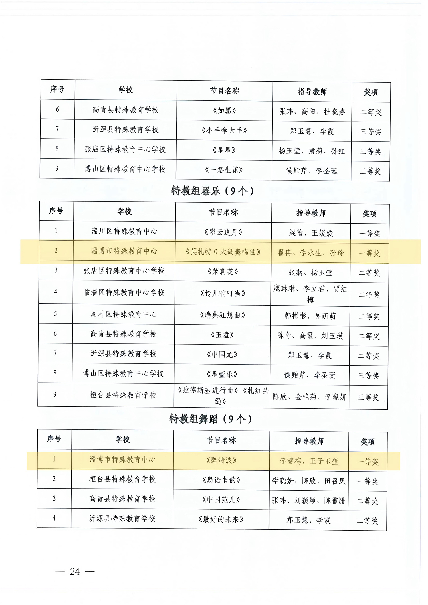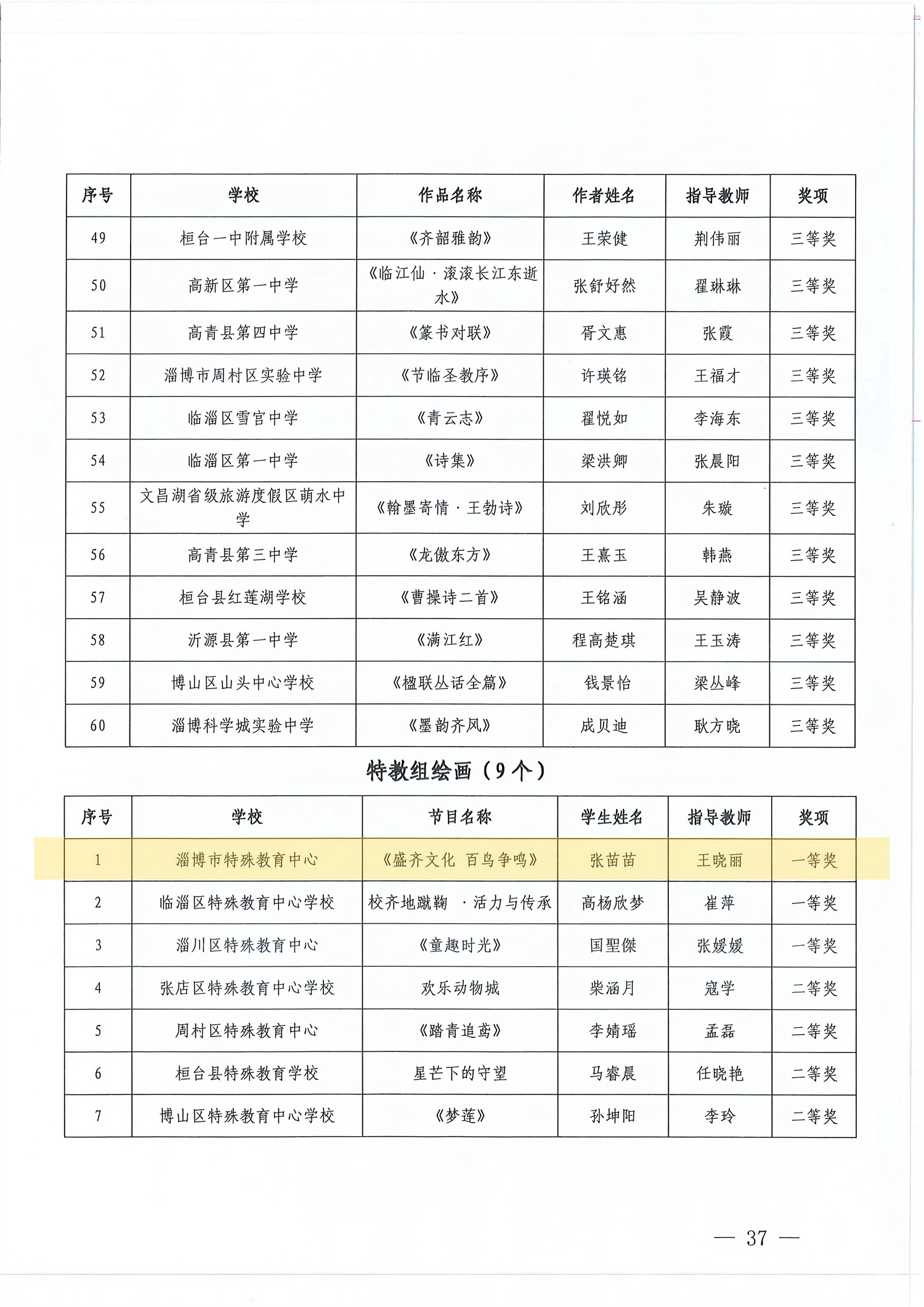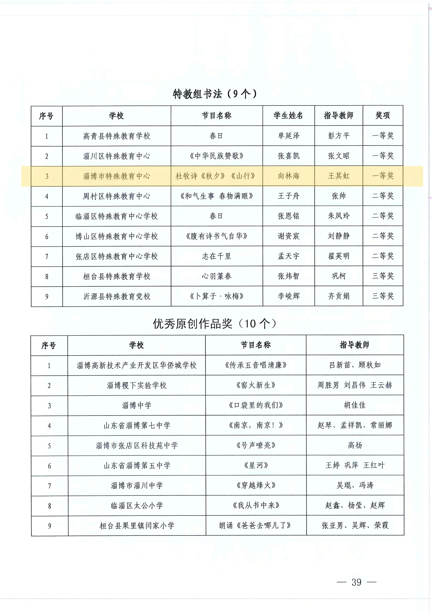 淄博市中小學(xué)生“百靈”藝術(shù)節(jié)活動每年舉辦一屆,是全市規(guī)格最高、規(guī)模最大、影響最廣的學(xué)生美育成果展示平臺。本屆活動首次專設(shè)特教組并以現(xiàn)場展演展示的形式進行了評選。學(xué)校精心選送的藝術(shù)展演類《在燦爛的陽光下》《莫扎特G大調(diào)奏鳴曲》《醉清波》3個節(jié)目、藝術(shù)作品類《盛齊文化 百鳥爭鳴》《杜牧詩<秋夕><山行>》2件作品在評選中脫穎而出,全部榮獲一等獎。創(chuàng)造了歷屆活動以來的最好成績,為學(xué)校“以美育人”工作繪就了濃墨重彩的一筆。